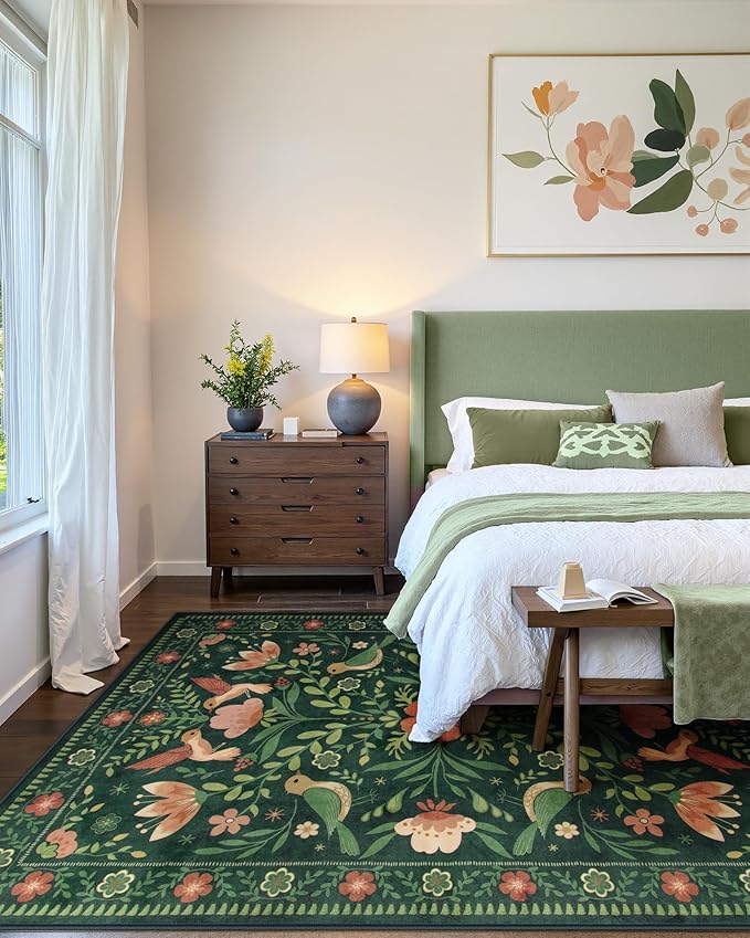 • [Bright and Elegant Design]: Featuring a beautiful bird and flower pattern with bright, vivid colors, this rug adds a touch of elegance and charm to any room, effortlessly complementing a variety of décor styles