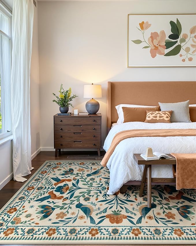 • [Bright and Elegant Design]: Featuring a beautiful bird and flower pattern with bright, vivid colors, this rug adds a touch of elegance and charm to any room, effortlessly complementing a variety of décor styles
