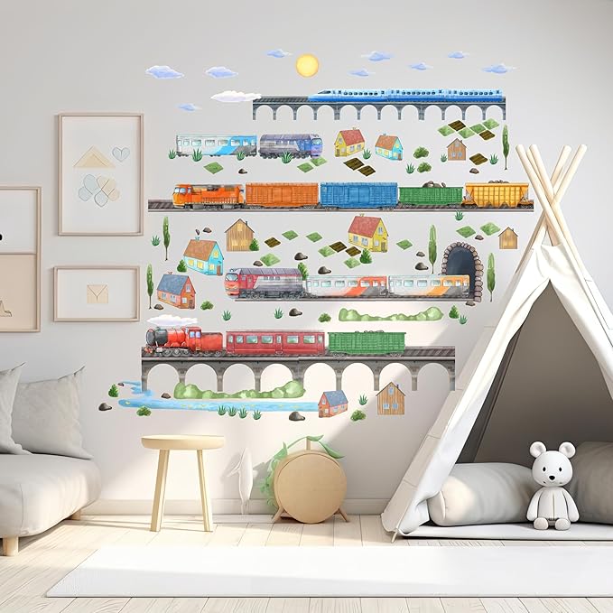 • 🌈 Learn and Play. Play is a way to spend fun time with your child, place the stickers on the wall together, and learn the name of each item. Every child is full of curiosity, wall decals for kids are a great tool to explore the world around them. Train wall stickers for boys are good idea for boys bedroom.
