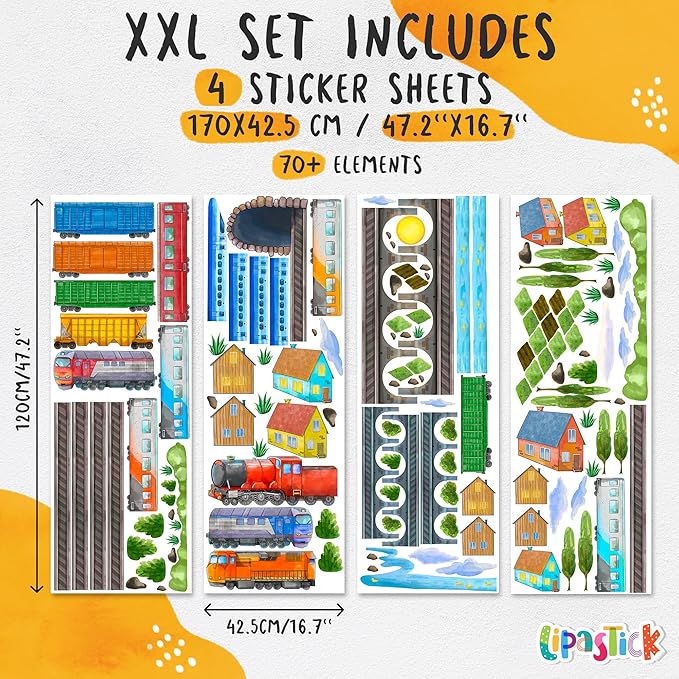 • ⭐ Instantly bring a boring wall to life with this nursery decor for kids' rooms, featuring a variety of locomotive, tube, carriage, train, bridge and railway stickers. Train wall decals come in a pack of 4 sheets. This set of stickers is size XXL and its size on the wall is 157"" x 98"