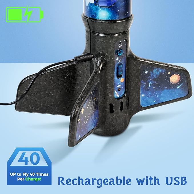 • ♻️Rechargeable Rocket: This electric rocket is powered by a rechargeable lithium battery, offering 25 to 40 launches on a single charge. With the included charging cable, a quick 30-minute charge is all it takes to keep the fun going, making outdoor games even more exciting.