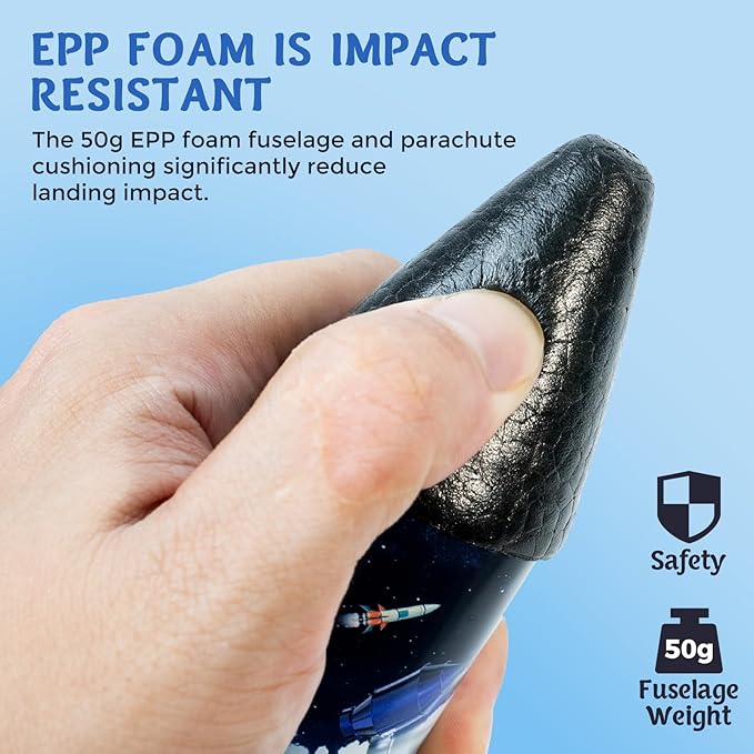 • 💪Safe and Stable Design: The upgraded circular propellers are lighter and softer, providing higher and more stable flights while being safe for kids. (Propellers must be installed before use.) The lightweight EEP foam body boosts launch height, and the parachute deploys automatically at peak altitude for a smooth landing.