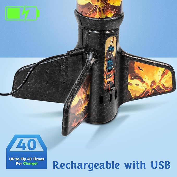 • ♻️Rechargeable Rocket: This electric rocket is powered by a rechargeable lithium battery, offering 25 to 40 launches on a single charge. With the included charging cable, a quick 30 minute charge is all it takes to keep the fun going, making outdoor games even more exciting.