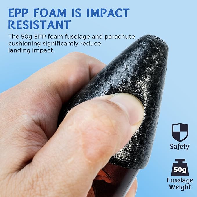 • 💪Safe and Stable Design: The upgraded circular propellers are lighter and softer, providing higher and more stable flights while being safe for kids. (Propellers must be installed before use. The lightweight EEP foam body boosts launch height, and the parachute deploys automatically at peak altitude for a smooth landing.