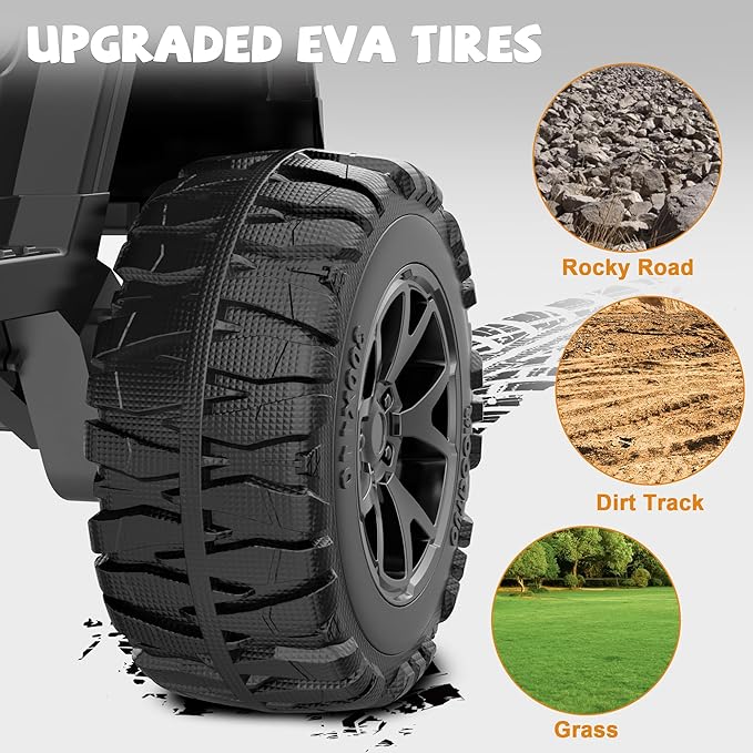 • [Conquer Any Terrain] The ride on car's 4 large-diameter EVA explosion-proof tires offer better traction, wear resistance, anti-slip properties and durability compared to ordinary plastic tires, making this off-road kids ride on toys can conquer most types of roads, such as sidewalks, grass, or gravel. Its excellent suspension system will reduce bumps and vibrations, providing a comfortable ride to the little drivers. Whether playing or exploring, this kids electric car empowers kids to confidently tackle the outdoors, turning every journey into an exciting adventure
