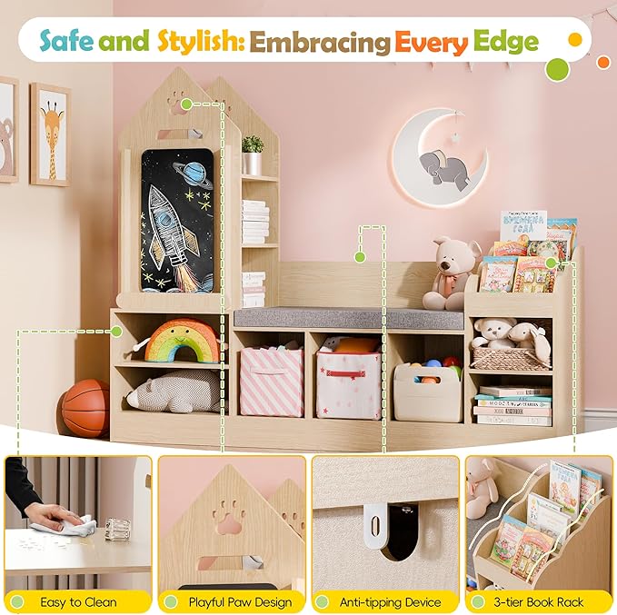 • Ample Storage for Every Need: Designed with versatile storage solutions, including a three-tier house-shaped cabinet, multiple cubbies, and a bench with storage compartments, this bookshelf keeps your child's room tidy and their favorite items within easy reach.
