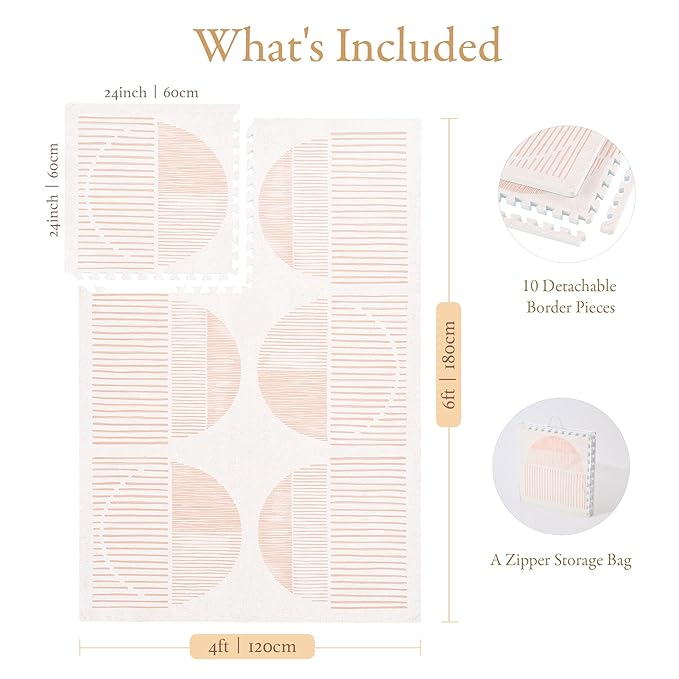 • 【LARGE AND THICKER FOAM PLAY MAT】The PopsyKosy playmat is a large and thick foam mat that comes with 6 interlocking tiles, each measuring 24"x24". The 0.5" thick padding provides a cushioned and safe play area for babies and toddlers, ensuring their comfort and safety during playtime. To maximize both the aesthetics and functionality of your play mat, choose a size configuration that covers the entire room/space.