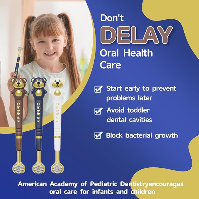 • 【Value 3-Pack for Family Convenience】 Our economical set includes three vibrant toothbrushes (white, brown, blue) suited for both boys and girls. This triple-angle toothbrush follows the ADA recommendation to replace toothbrushes every 3 months, keeping your child’s oral care fresh and effective.