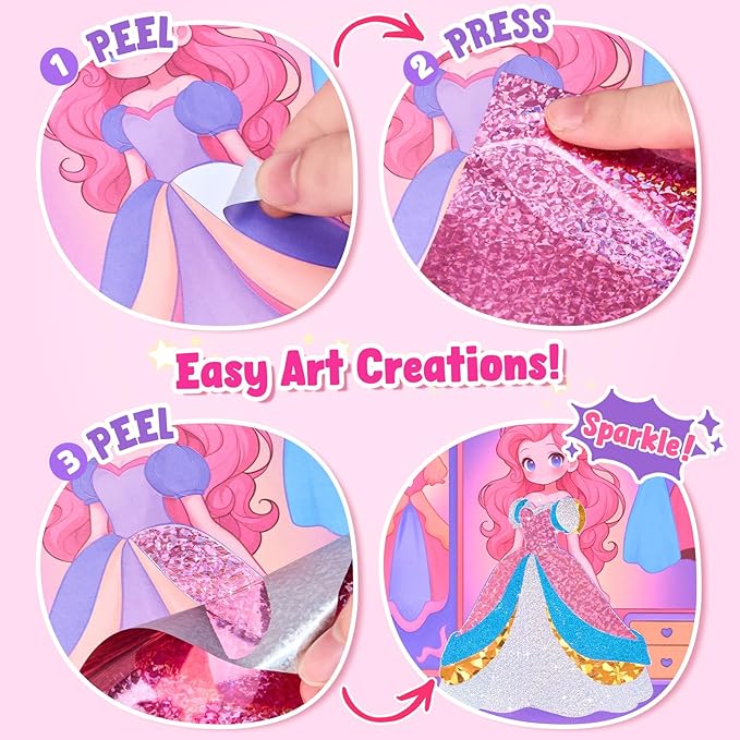 • Sparkling Craft Art, Easy to Create Stunning Princess and Magical Pony Effects: Craft is simple yet incredibly fun! Simply peel away parts of the design to reveal the sticky surface, apply the sparking pieces, then gently peel it off to reveal a dazzling princess artwork. Not only will kids experience the joy of success, but they will also improve their focus and fine motor skill from this craft activity. The vibrant princess-themed artwork will leave kids proudly showcasing their creations