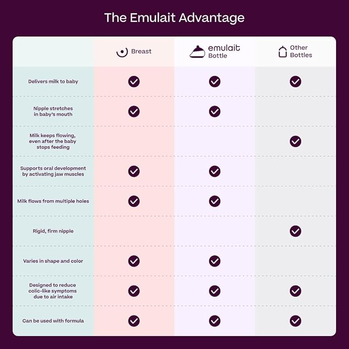• Revolutionary Nipple Innovation: Emulait nipples replicate the softness, texture, and elasticity of a real nipple, fostering natural suckling actions and oral development. Uniquely stretchable so that baby needs to work as they would when nursing, for a feeding journey that supports easier transitions between bottle and breast