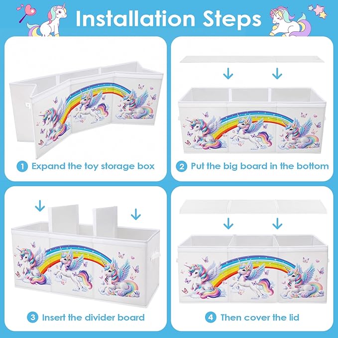 • 【Convenient Divider Design】 Our cube toy box is designed with a velcro flip lid, which helps to prevent dust from getting in, and there are two removable dividers in the center, which can be turned into different storage spaces, and large toys can be put, making it easy to reach for items.