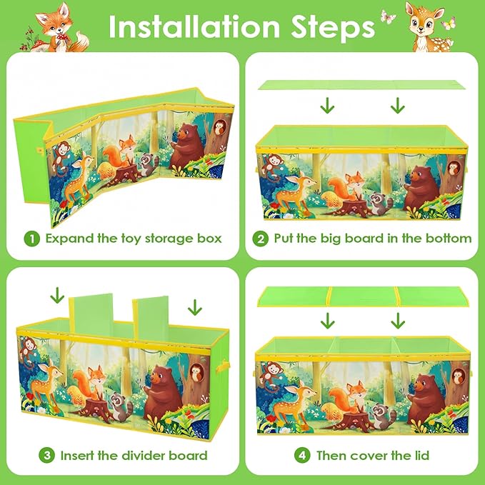 • 【Convenient Divider Design】 Our cube toy box is designed with a velcro flip lid, which helps to prevent dust from getting in, and there are two removable dividers in the center, which can be turned into different storage spaces, and large toys can be put, making it easy to reach for items.