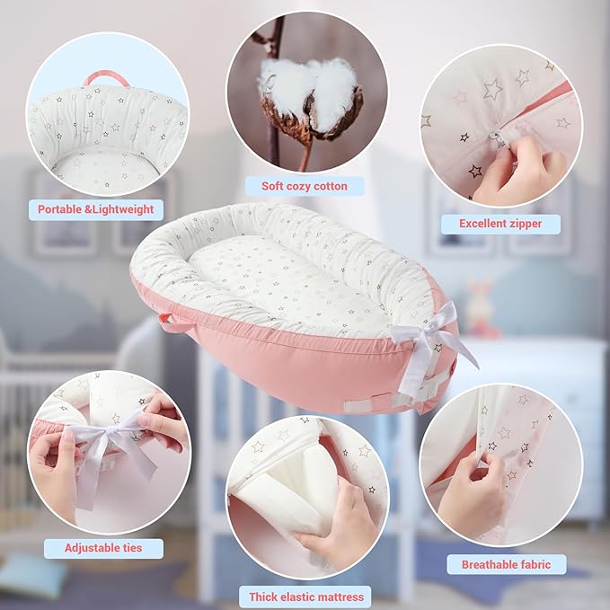 • 【Double-side Use & Adjustable】 Our baby lounger offers a double-sided design with different colors, allowing you to change either sides you want. Both sides are made of high-quality cotton fabric that is soft and skin-friendly. Also, it is easy to clean in a washing machine. Additionally, this lounger features an adjustable bow tie that allows you to customize the size and shape of the lounger, making it suitable for babies aged 0-24months.