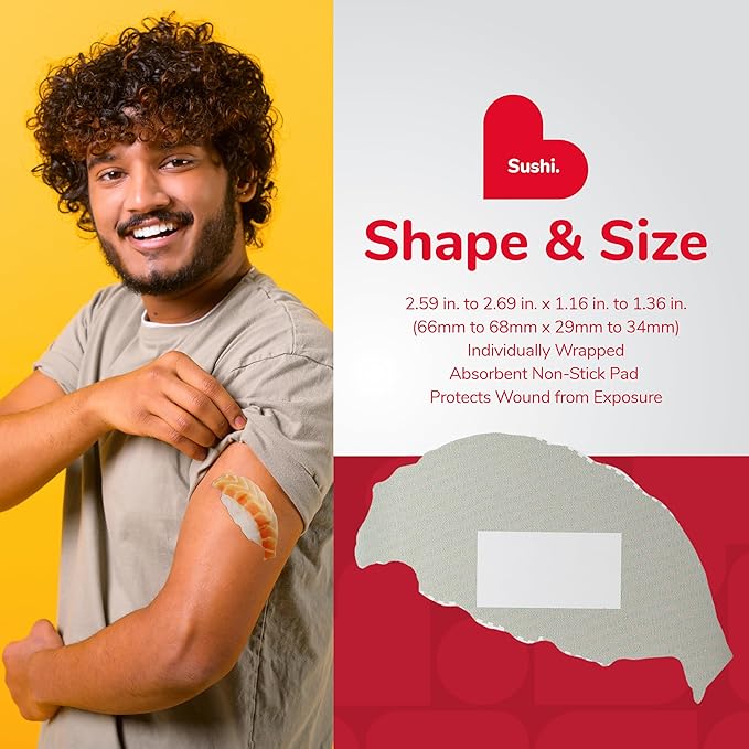 • SUSHI BANDAGES: This 24 piece pack of Sushi shaped bandages features 3 fun sushi shapes, and is great for putting a smile on kids' faces while protecting wounds such as cuts, scrapes, and burns; sticky bandages come in a cute cardboard box and are perfect for kids and adults alike, and also for school nurses and pediatric doctors