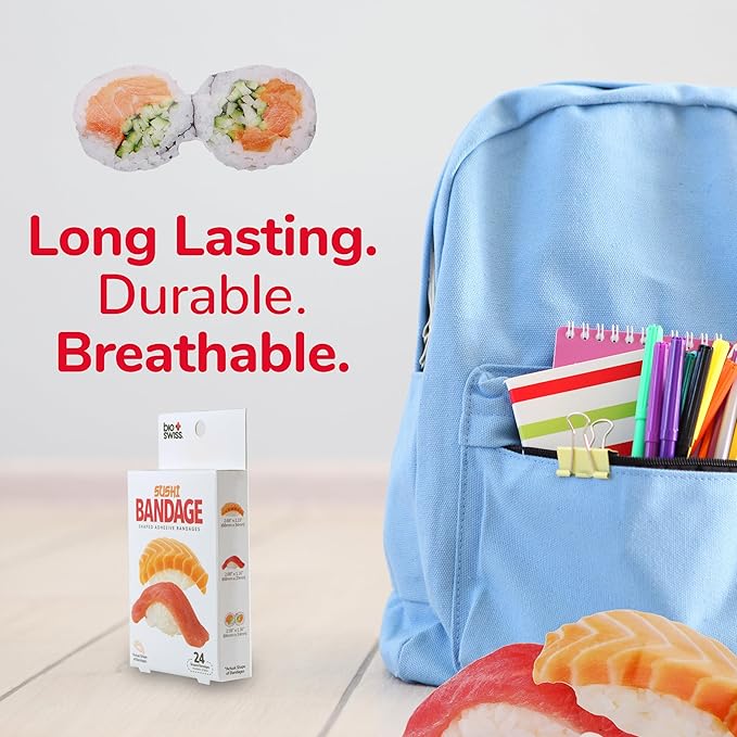 BioSwiss Bandages, Sushi Shaped Self Adhesive Bandage, Latex Free Sterile Wound Care, Fun First Aid Kit Supplies for Kids and Adults, 24 Count