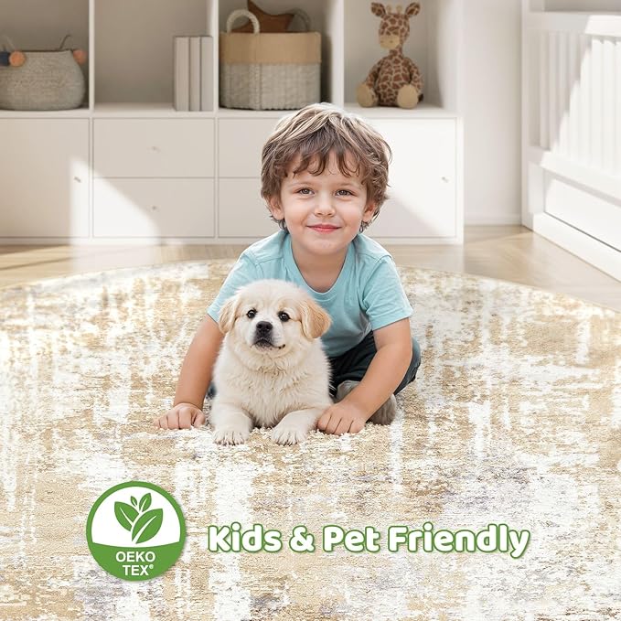 Round Rug Living Room Rugs: 6Ft Washable Circle Large Abstract Modern Soft Stain Resistant Non Slip Indoor Floor Carpet for Bedroom Nursery Office Dining Room Dorm Home House Decor- Gray Gold