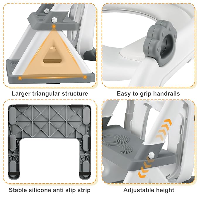 • Stable Triangular Structure:Our latest toilet step stool with a upgrade triangular structure that is more stable than ever before. The seat's base features a 6-point anti-slip mechanism for steadfastness,offering ample space and safety for climbing, meffectively addressing common issues of seat wobbling. Anti slip handrails make it easier for children to climb.