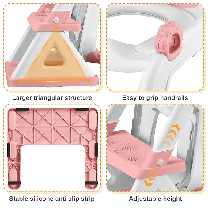 • Stable Triangular Structure:Our latest toilet step stool with a upgrade triangular structure that is more stable than ever before. The seat's base features a 6-point anti-slip mechanism for steadfastness,offering ample space and safety for climbing, meffectively addressing common issues of seat wobbling. Anti slip handrails make it easier for children to climb.