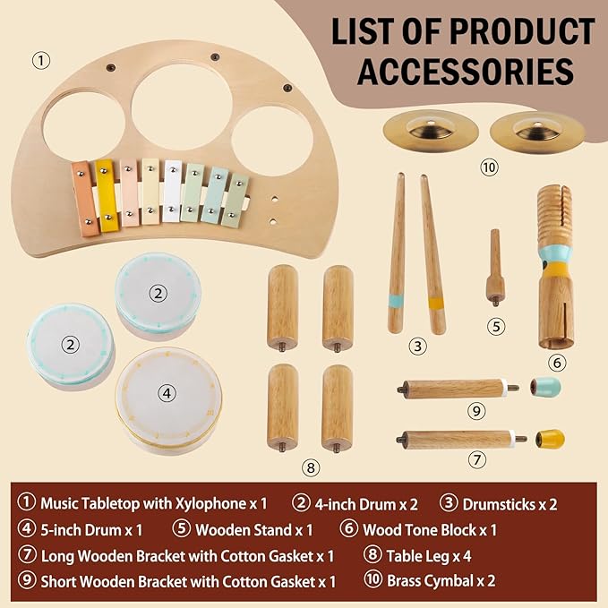 • Neutral Colors Wooden Baby Toys:All the materials and colors of our montessori toys come from nature.These montessori wooden toys can keep baby focused and calm,improving children's concentration. An all-in-one musical instrument featuring 3 drums, 2 drumsticks, 2 cymbals, a sound block and a xylophone. Have 4 stable legs, allowing children to easily play tunes or tap rhythms.