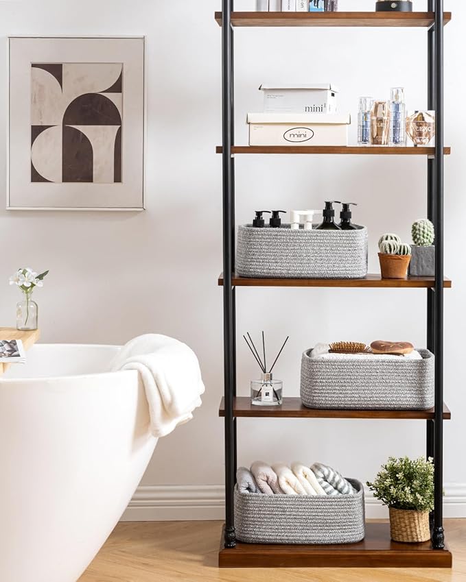 • [ Elegantly Designed to Match Any Décor ] Our small rope basket creates a minimalist appearance, and it adds a touch of warmth and texture to any room. The classic solid color design ensures seamless integration with your existing aesthetics, complementing any decoration. Perfect as decorative storage baskets for shelves, cabinets, and any open display space, making them a stylish and practical addition to any decor, enhancing the overall aesthetics of your room