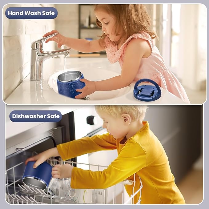 • New Buckle of Lid: The food containers feature a press-seal construction, allowing you to simply pull the handle upwards to 90° to open the lid/ 90° downward closure. This design is maintaining vacuum no need to rotate the lid open . Additionally, the container comes equipped with a carrying handle, making it convenient for your child to carry it. Whether at school, an outdoor outing, or a family gathering, this user-friendly design empowers children to confidently enjoy their delicious meals.