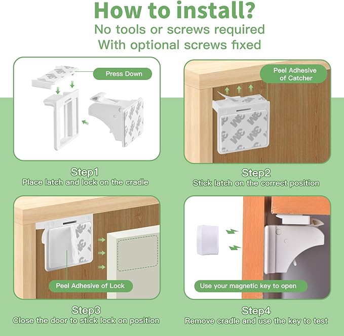 • [ 20 LOCKS + 2 KEYS ] Vkania magnetic cabinet locks are perfect for baby proofing cabinets and drawers. These child proof cabinet locks feature a strong magnetic design to keep curious toddlers and pets out. Easy to install with 3M adhesive—no tools, drilling, or holes required. Ideal for baby safety locks for cabinets in kitchens, bathrooms, and more.