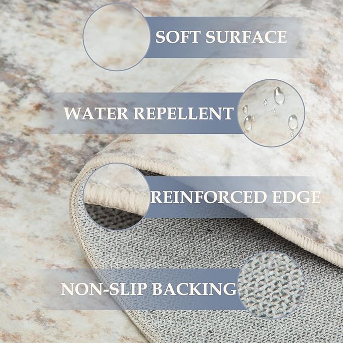 • Tides Series – Effortless style that flows with your life.This modern machine-washable non-slip rug features reinforced edges and a low-pile design that resists dirt. Its water-repellent surface makes spills easy to clean - liquids bead up for quick wiping. Simply machine wash in cold water (no bleach) to refresh. The non-slip backing keeps it securely in place. A perfect blend of function and contemporary design for active homes.
