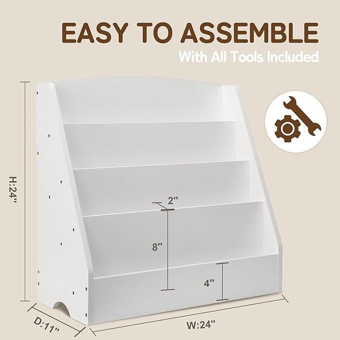 • 【STIMULATES CURIOSITY】- At 24" x 11" x 24" (L x W x H), this book shelf has a right height for children, allowing them to easily view and pick up their favorite books. Books can be displayed by front cover instead of the spine, making it easier for kids to choose books, fueling their love for reading.🪄📚
