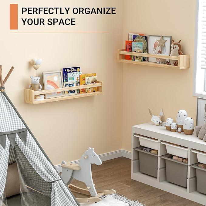 • [Ample Storage Space] - Measuring 24 inches, these nursery shelves offer ample room for organizing children's books, toys, photos, and other small items. They encourage a love for reading while keeping spaces tidy. With 0.6” thicken panels, each bookshelf can hold up to 30 LBS
