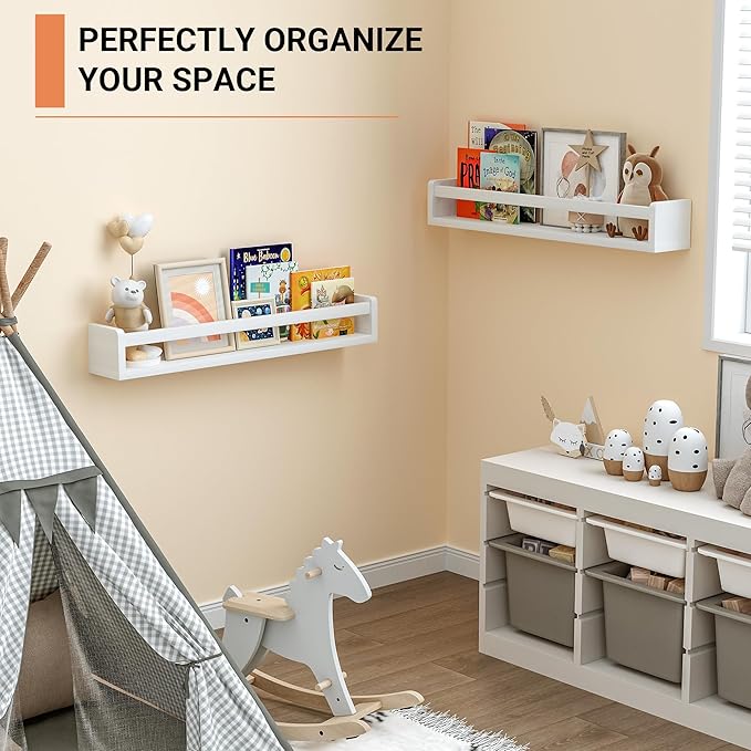 • [Ample Storage Space] - Measuring 24 inches, these nursery shelves offer ample room for organizing children's books, toys, photos, and other small items. They encourage a love for reading while keeping spaces tidy. With 0.6” thicken panels, each bookshelf can hold up to 30 LBS