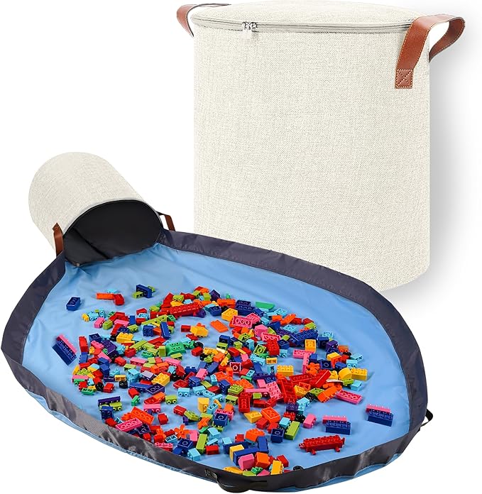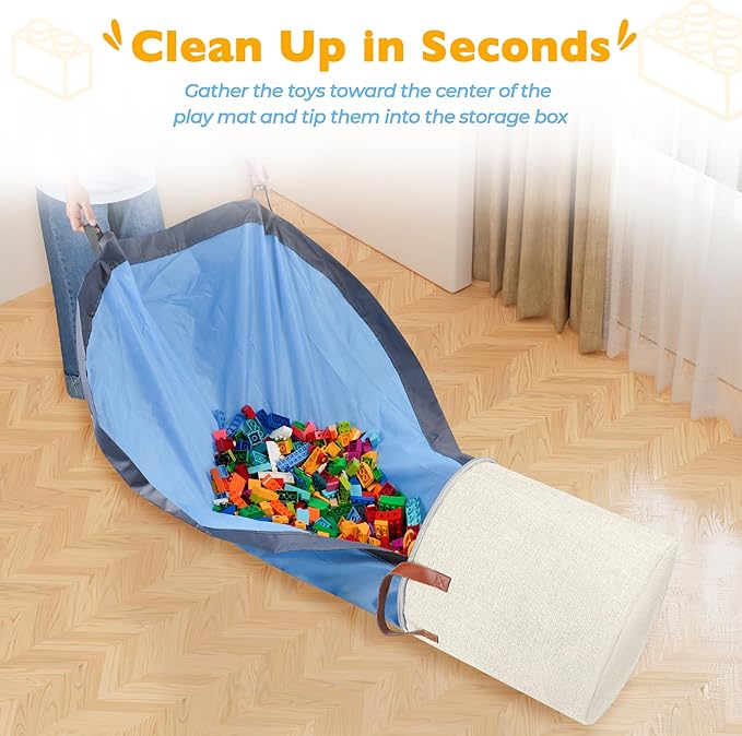 • Tidy Up In Seconds – This storage organizer provides ample storage for building bricks and other small toys. Spread out the play mat, and now you have a dedicated area for creative play. When it's time to pack up, gather the handles of the play mat and gently tip all the toys back into the compact storage cube. The mess is easily cleared away instantly.