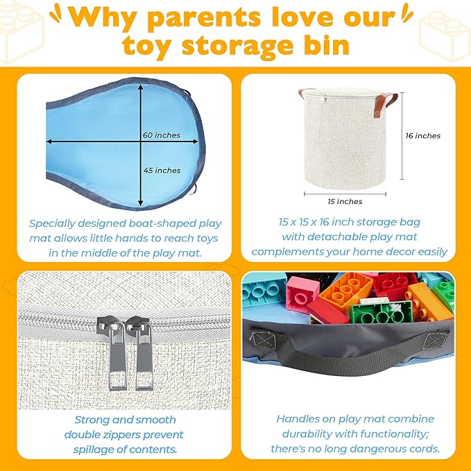 • Safe, Functional And It Has Zippers – There are no tangly cords or buttons to worry about, making it safe for kids of all ages. Our play mat has durable handles for tipping the toys back into the storage bin. We have also included double zippers on the lid so that nothing can spill out accidently. Warning: Children below 3 years of age must be supervised when using this storage bin and its play mat.