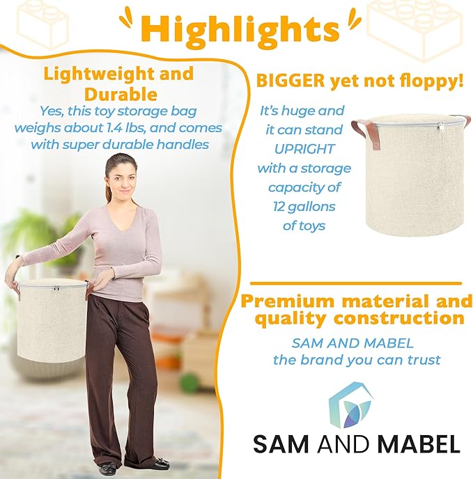 SAM AND MABEL XXL Toy Storage Organizer with Play Mat – 15" x 15" x 16" Storage Bin for Kids' Playroom, Foldable Nursery Fabric Basket (Ivory)