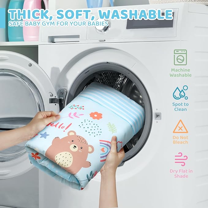 • Soft, Safe, and Washable - The baby play gym mat is made from high-quality fabrics, thick, delicate, and smooth touch, safe and comfortable for baby skins. Machine washable, easy to clean and keep hygienic. The tummy time activity mat can also be used directly on the floor, providing cushioning and protection for the baby. The balance of flatness and softness makes it more stable for babies to sit, stand and crawl.
