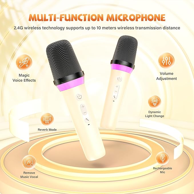 • Powerful 3D Surround Sound: Karaoke machine with 2 wireless microphones features high-performance HiFi speakers that deliver loud, clear highs and deep, rich bass. The vibrating, illuminated modules on both sides amplify the bass effect, creating an immersive 3D surround sound experience. Karaoke machine for kids is perfect for family gatherings, birthday parties, or any fun karaoke night