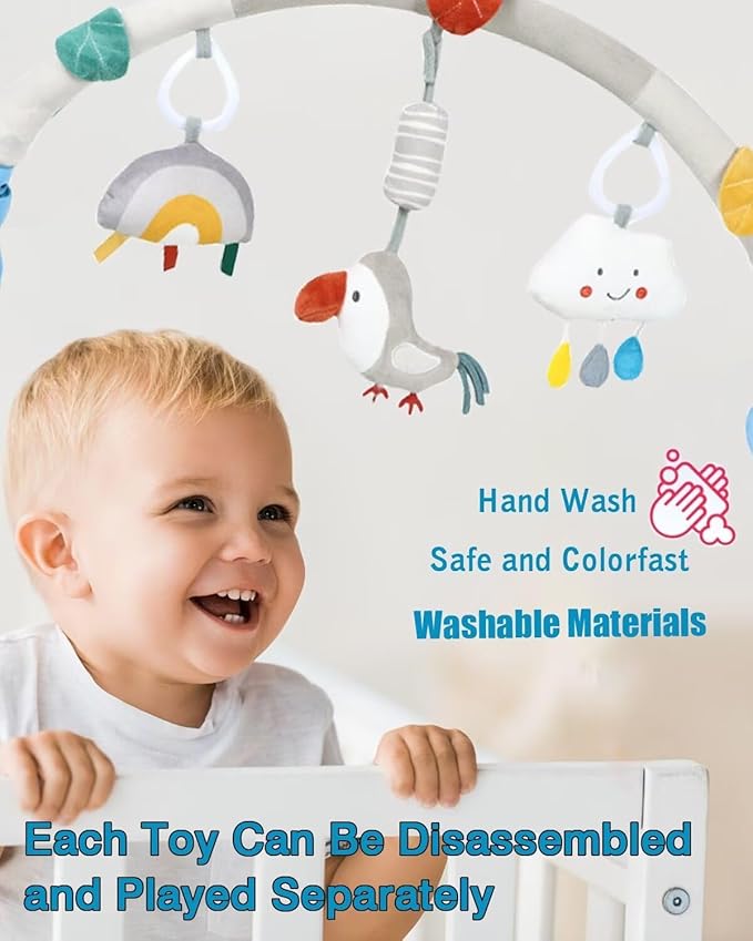 • Carseat toys for infants 0-6 months,Stroller toys have variety of graphics,bird built-in wind chime.Cute cloud have rustling.Bullt-in BB squeaker in the Rainbow belly,press to make a Bi~ Bi~ sound.