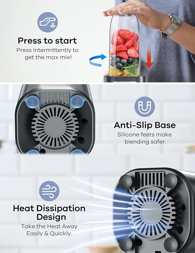 • LARGER CAPACITY & PORTABLE DESIGN: The personal blender features one 24oz and two 17oz blender cups and two to-go lids, add extra portability for carrying to the office, gym, class, car, or in your bag. All parts are No-BPA to ensure healthy drinking.