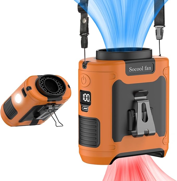 Socool 10000mAh Portable Waist Fan Clip on Wearable Belt Personal Fan Rechargeable Battery Operated with 5 Speeds & Flashlight Neck Hands-Free 40H Cooling for Outdoor Travel Power Bank (Orange)