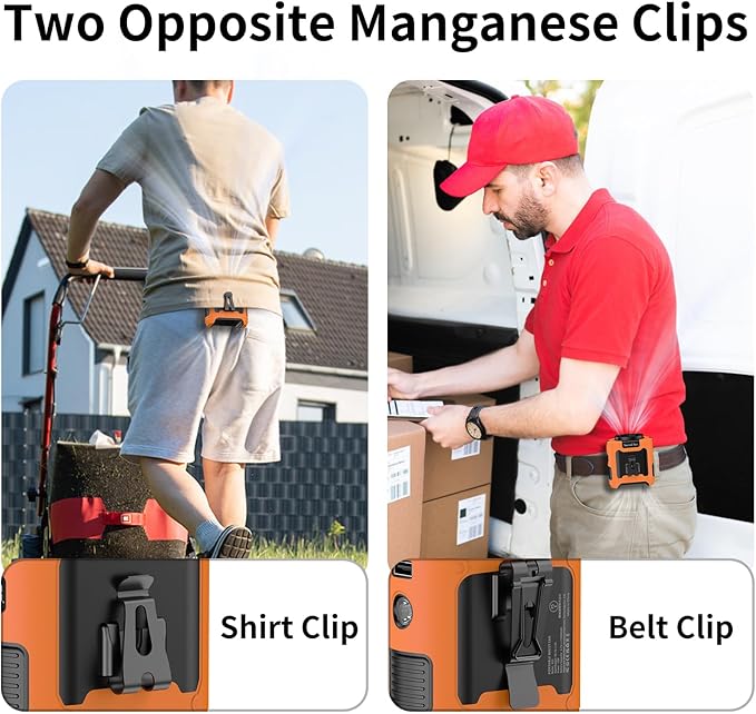 • 【With Silicone Cover, Non-Slip and Anti-Drop】Our mini portable waist fan is designed for various outdoor usage scenarios, catering to occupations like workers and farmers. It comes with a high-quality protective silicone leather case which protects from shock when dropped and ensures the body fan is not damaged at all. The upgraded Manganese steel clamp provides stronger gripping force, always keeping the wearable fan firmly, and is more durable. Practical design with two clips facing opposite directions allows for more placement options