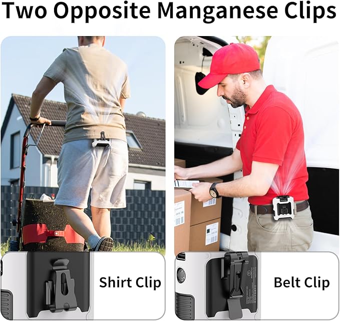 • 【With Silicone Cover, Non-Slip and Anti-Drop】Our mini portable waist fan is designed for various outdoor usage scenarios, catering to occupations like workers and farmers. It comes with a high-quality protective silicone leather case which protects from shock when dropped and ensures the body fan is not damaged at all. The upgraded Manganese steel clamp provides stronger gripping force, always keeping the wearable fan firmly, and is more durable. Practical design with two clips facing opposite directions allows for more placement options