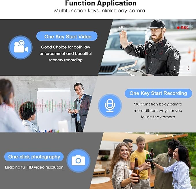• 【Multifunctional Application】Kaysunlink Mini Body Camera is lightweight & compact,It can be used almost anywhere, Climbing, skiing, cycling, hiking, surfing. It's portable that can either be clipped on your backpack or put in your pocket. Perfect for Hiking, Driving Record, Meeting Record,Outdoor sports.