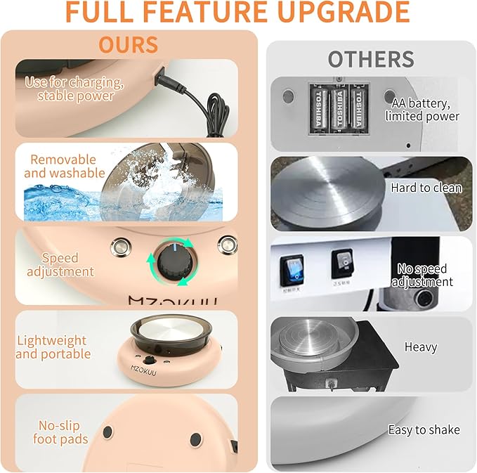 • Complete Pottery Set: This mini pottery wheel comes with everything beginners need to get started, including a ceramic wheel, 2 packs of air-dry clay, 8 shaping tools, 8 carving tools, 12 paints, a mixing palette, and brushes.