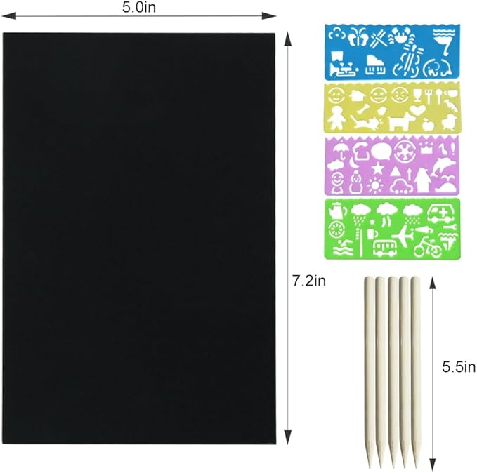 • SCRATCH RAINBOW ARTS KIT INCLUDED: 50 Pcs scratch paper, 50 Pcs wooden stylus, 4 Pcs drawing stencils. Many accessories in our scratch paper art can make children enjoy themselves. They can use the stencils for design more cute and colorful shapes,which will give them hours of fun and creativity