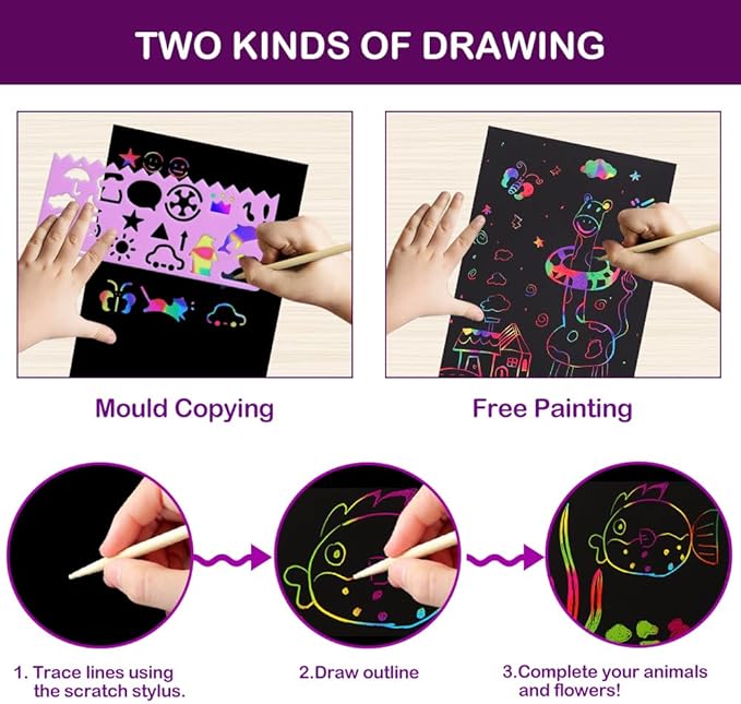 • EASY TO USE: Directly scratch the surface of black scratch off paper with the wooden stylus to reveal the amazing colorful patterns underneath. The scratch off art kit can increase visualization skills and creativity of children. It's a great way to encourage your kids 6-8 years old to write fun notes and draw pictures for each other, and for friends and family