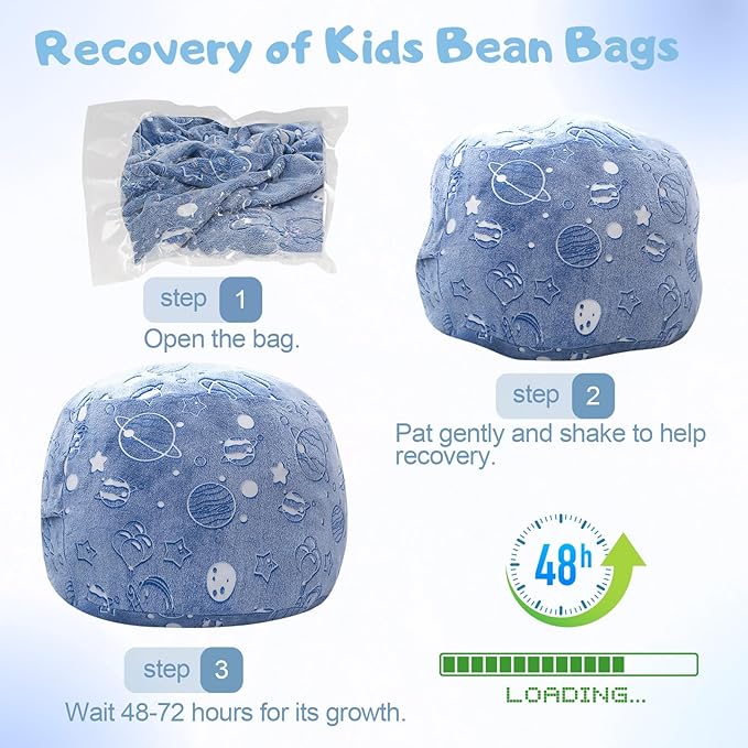 • Inflate 24-72 Hours: The kids' bean bag couch arrives compressed. Shake it initially and continue gently shaking over the next few days to help the filling expand evenly and achieve full rebound