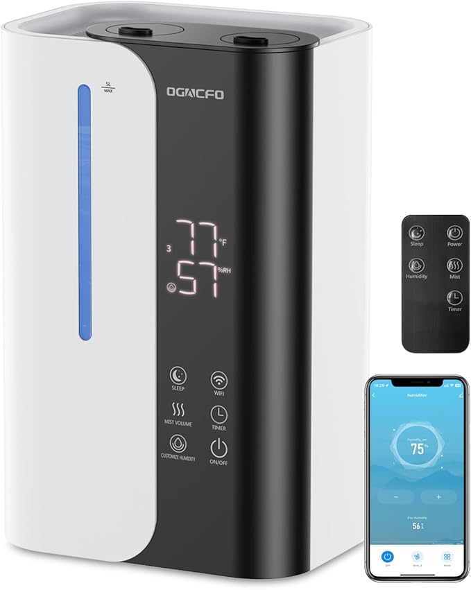 • ๐’๐ฆ๐š๐ซ๐ญ ๐‚๐จ๐ง๐ญ๐ซ๐จ๐ฅ ๐ฐ๐ข๐ญ๐ก ๐“๐ฎ๐ฒ๐š ๐€๐ฉ๐ฉ: Connect this large humidifiers for home to Wi-Fi and control it remotely through the Tuya app. Turn it on/off, adjust humidity levels, modify mist output, set a 24-hour countdown, and more, all from your phone