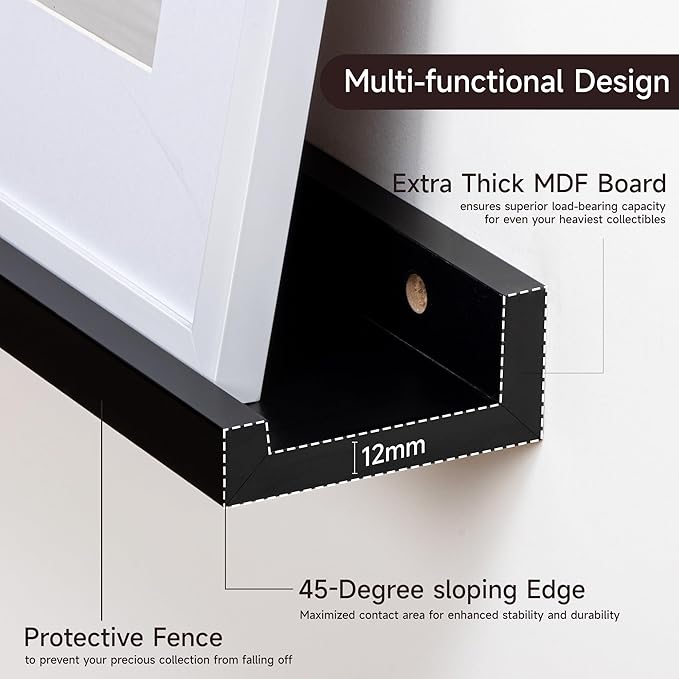 • 3.5" PICTURE LEDGE DESIGN: Ideal for displaying photos, artwork, or collectibles, these feature a thoughtful extremely narrow 3.5-inch width ledge design to prevent items from sliding forward, its mounting holes are spaced 16 inches apart for secure mounting to wall studs uncluttered aesthetic