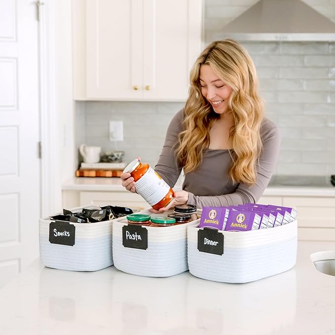 • Safe, Natural Cotton Organizer Bins: Crafted from the highest quality material in the market, our storage bins are oh-so-sturdy (and cute) and ready to take on little humans. They’re 100% safe, so you can rest easy if teething toddlers take a nibble. Reinforced Hidden Handles: Now you see ‘em, now you don’t! With completely hidden handles that blend seamlessly into the rope basket, you’ll be the Houdini of home organizing. They’re even double-stitched and reinforced for extra heavy loads!