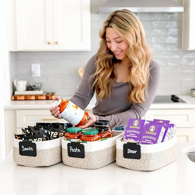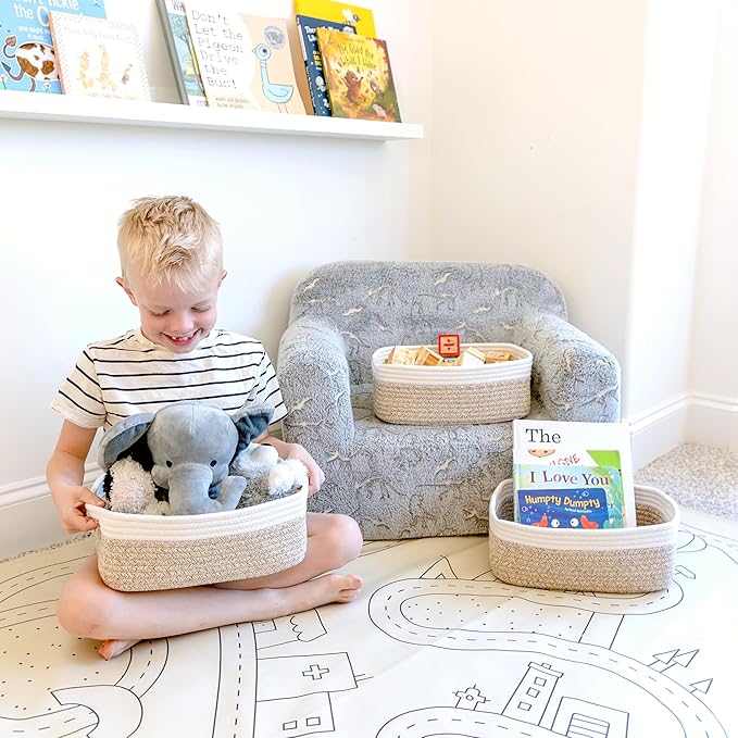 • Safe, Natural Cotton Organizer Bins: Crafted from the highest quality material in the market, our storage bins are oh-so-sturdy (and cute) and ready to take on little humans. They’re 100% safe, so you can rest easy if teething toddlers take a nibble. Reinforced Hidden Handles: Now you see ‘em, now you don’t! With completely hidden handles that blend seamlessly into the rope basket, you’ll be the Houdini of home organizing. They’re even double-stitched and reinforced for extra heavy loads!