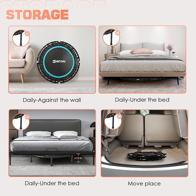 • Fairly Easy to Assemble: BCAN fitness trampoline comes with 60% pre-assembled, Only 10 minutes to complete the assembly with our special tool